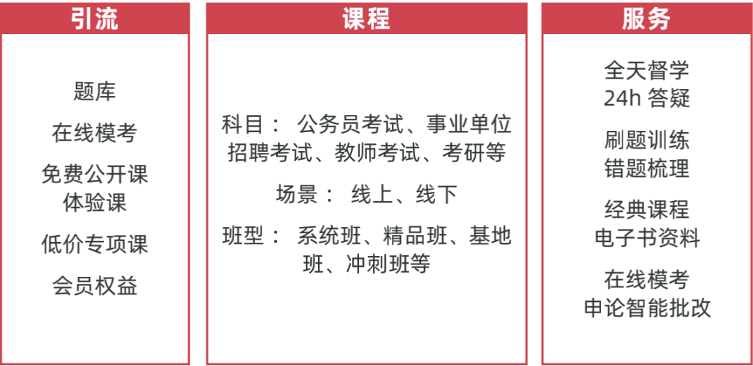 公考赛道龙头企业通过自身在管理、研发、运营和渠道等方面的成熟经验,可以进一步巩固品牌优势,形成正循环,而新入局公司则可通过差异化定位,瞄准细分人群,进行差异化的品牌塑造。