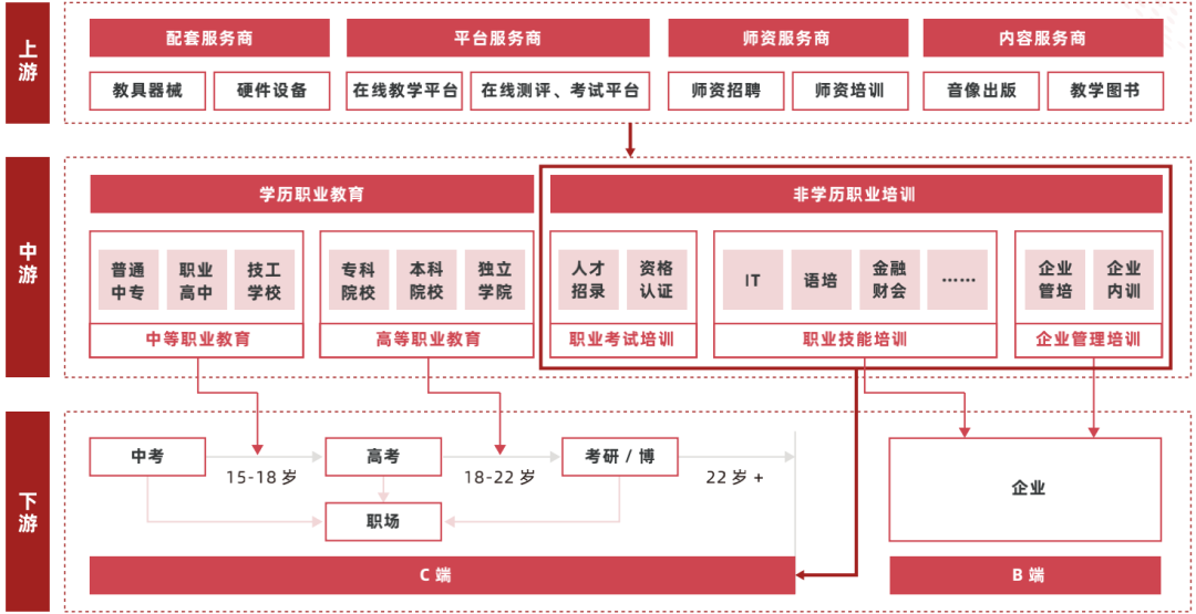 职业教育产业链的上游由配套服务商、平台服务商、师资服务商和内容服务商构成。中游由学历和非学历的职业教育服务商构成,主要提供教育和培训服务。下游则为职业教育需求方,其中现阶段学历职业教育主要面向 15-22 岁的 C 端学生,非学历职业培训的受众则更为广泛,基本覆盖了中考毕业以后所有年龄阶层的学生,此外职业技能培训和企业培训公司还向 B 端企业提供服务。