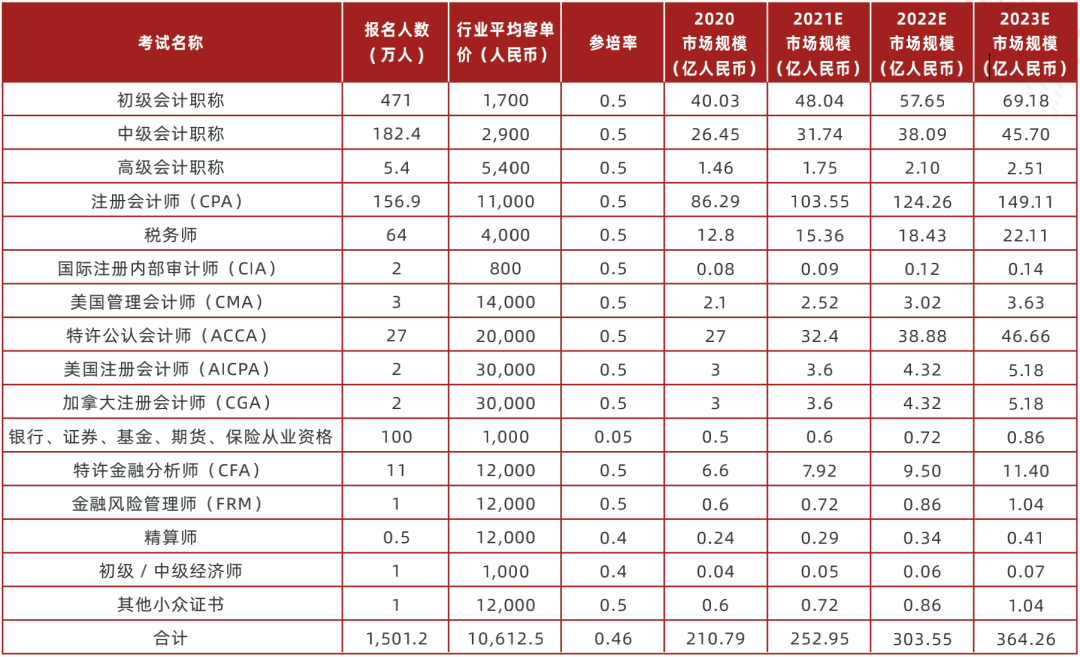 2023 年金融财会考证培训市场规模有望突破 360 亿人民币。国内外各金融财会证书考试报名人数如下表所示,其中,客单价的统计是根据行业内代表性公司的平均客单价计算的,参培率是根据不同品类的实际情况估算的。估算出不同证书的未来三年不同的增长率,假设参培率与客单价不变,预计 2021 年、2022 年、2023 年金融财会考证的市场规模分别为 252.95 亿人民币、303.55 亿人民币及 364.26 亿人民币。