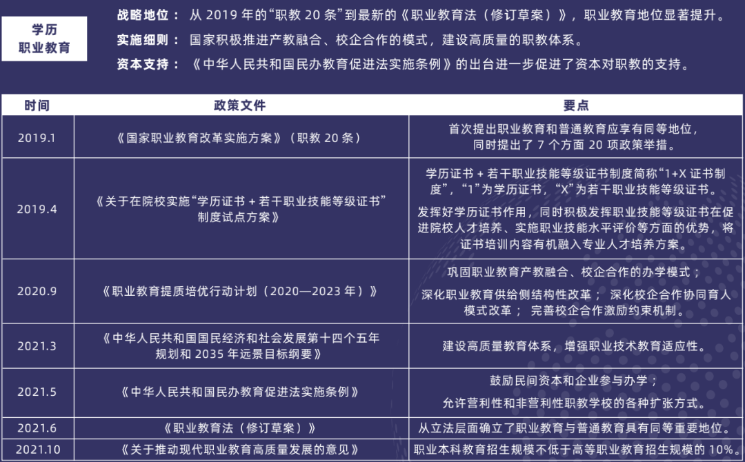 从长期战略规划到短期实施细则,政策对学历职业教育的催化作用显著。